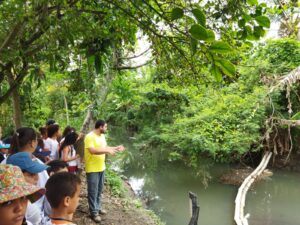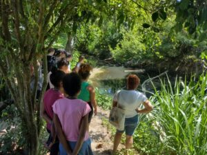 -Educação ambiental em escolas, associações de moradores e empresas da microbacia. As ações incluem palestras, visitas guiadas à ecobarreira e à trilha do rio, além de oficinas de arte-educação com materiais recicláveis.