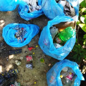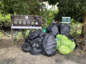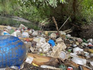 -Recomposição vegetal da margem esquerda do rio, próximo à ecobarreira, em parceria com o Coletivo Córregos da Tiririca. Embora atualmente essa etapa esteja pausada, o objetivo é retomar a recomposição em breve.