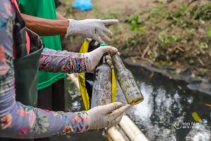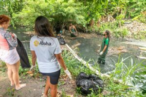 Paralelamente à instalação da ecobarreira e à coleta de resíduos, o projeto desenvolve uma série de ações integradas para promover a renaturalização e recuperação do curso hídrico do Rio João Mendes: