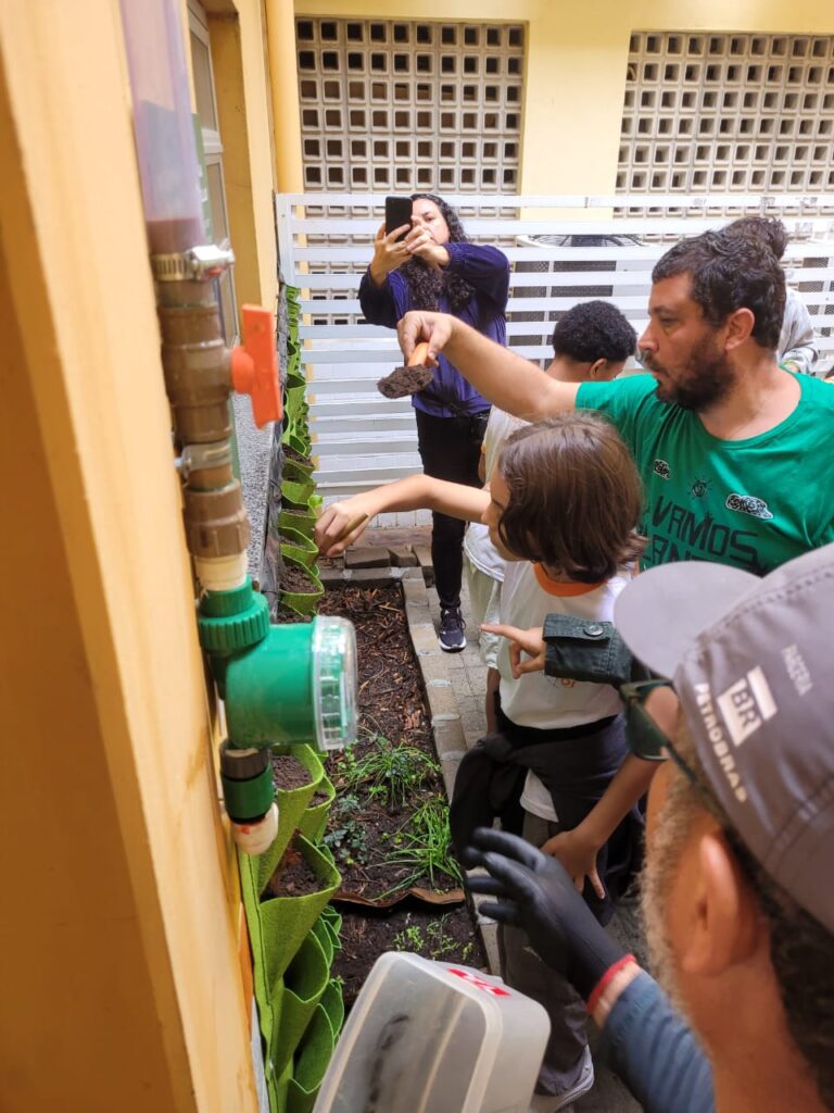 Durante as atividades, os participantes conhecem técnicas de plantio e manejo agroecológico, e interagem com sistemas sustentáveis como a irrigação automatizada por captação de água da chuva — solução simples e eficiente que mantém os canteiros produtivos e vivos de forma ecológica.