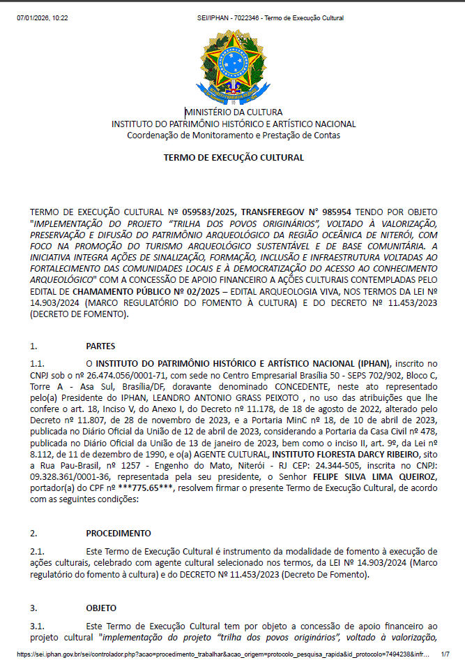 Em síntese, o projeto atua como uma ação de mediação entre passado e presente, promovendo o diálogo entre arqueologia, educação e comunidade. O Termo de Fomento possibilitará a execução articulada dessas ações, assegurando que a memória e o conhecimento sobre os povos originários da Região Oceânica de Niterói sejam preservados, divulgados e experienciados de forma inclusiva, participativa e sustentável.